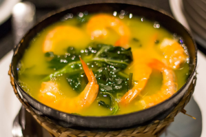 Uma espécie de sopa com caldo de tucupi (molho de mandioca brava) e goma (farinha de tapioca), para quebrar a acidez. As folhas de jambu dão um toque exótico, pois anestesiam a boca por alguns segundos. Para completar a receita: camarões salgados.