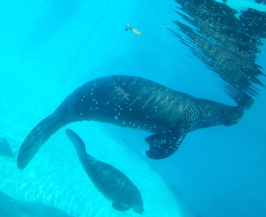 Além disso, o peixe-boi tem um filhote por vez e o cuidado parental leva até dois anos, todo o processo de reprodução dessa espécie é mais longo e demorado.